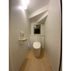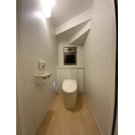 1階トイレ: タンクレスになり、不要な物を省いた空間は階段下とは思えないほど、広々とした明るいトイレ空間に。