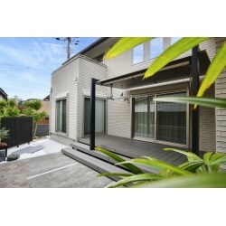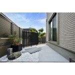 リビングの窓から見ても気持ちのいいお庭をイメージしました。和室から見える一角には、簡単な坪庭スペースをご提案。シックな色合いの壁と床面が和庭の優しい色遣いを演出しています。プライバシー対策として木目のフェンスを設置。床面の石材を組み合わせたアイポイント空間となっています。テラス屋根にはLIXILの注目商品「テラスSC」をご提案。天井材があることでよりプライベート空間の増したお庭に仕上がっています。テラスSCにはオプションでダウンライトを取り付けることができるので夜でもお食事を楽しんでただけます。