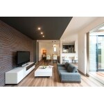 1Fはブラウン系、2Fはモノトーンで仕上げたリビング