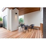 外壁の一部に木質感を出し、広いリビングをもっと広く見せられるウッドデッキを作りました。外構を絡めた工事が得意な弊社ならではのご提案です。