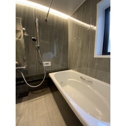 浴室をタカラスタンダードのプレデンシアへリフォーム。鋳物ホーロー浴槽にしかない、滑らかな肌触りと重厚感がバスルームで過ごす時間を極上のくつろぎ空間にしてくれます。グレー&ブラックでまとめたバスルーム。ライン照明がホテルライクな空間を演出してくれます。