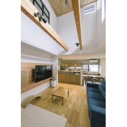 天井と壁を撤去し、広さと明るさを感じるLDK。 壁掛けテレビ壁面にはレッドシダーの羽目板を造作。 テレビの横にはレコーダーが収納されており、レコーダー本体はテレビ背面の収納からメンテンナンス することができます。 大空間に余計なコードが見えないような工夫の詰まった空間です。