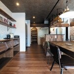 LDKは和室の間仕切り壁を取り払い、床はバリアフリーにした24帖の開放的な空間に間取り変更。 抜けない梁は残して塗装することで、古民家のような佇まいを加えます。 ダイニングキッチンの下がり天井に、ダークカラーのクロスを貼り、吊り下げシェルフを設けて、落ち着いたバーのような雰囲気に仕上げました。 大勢でもゆったり食事ができるよう、ダイニングテーブルと造作したバーカウンターを設けました。 対面キッチンからリビングが見えるので、テレビを見ながら作業できます。 キッチンとお揃いのカップボードを置かない代わりに、オープンの造作棚、キッチンに隣接したパントリーを設けて収納をしっかり確保しました。