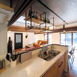 大勢で食事をする時に座る場所に困らないよう、バーカウンターを広めにとって造作し、イスを並べました。 天井から吊り下げられたオープンシェルフには、好きな銘柄のお酒を並べて、おうちバー気分を盛り上げます。