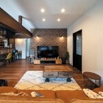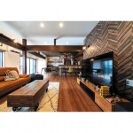 LDKは和室の間仕切り壁を取り払い、24帖の開放的な空間に造り替えました。 床材は、抗ウイルス加工を施したベリティスフロアーS ハードコートのチェリー柄。ロボット掃除機が通れるようバリアフリーです。 抜けない梁はダークブラウンで塗装することで、古民家のような佇まいを加えます。 大きなテレビ側の壁には、ワイルドなヘリンボーン柄のアクセントクロスを貼って、インパクトのある空間づくりをしました。