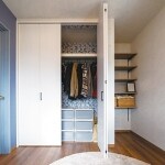 以前は足りなかった収納を確保。扉付きの収納内には、濃色のアクセントクロスを貼りました。ハンガーパイプに服を掛けられ、あまり使わない物は枕棚に置けます。 南海プライウッドのオープン棚は5段分取り付けました。棚の高さを変えることができ、飾りたい物をしっかり収納します。