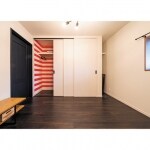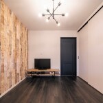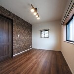 6.4帖の予備用の洋室は、前の間取りを生かして、収納を増やしました。 板張りの壁でしたが、天井と壁を白に近いウォームカラーの石塗り調クロスに貼り替え、窓からの光とともに明るい印象に変わりました。 引き戸側の壁面に、渋さと重厚感のあるアクセントクロスを貼って、ヴィンテージ感を高めます。 錆びた金属をレンガ貼りしたようなテクスチャーで、引き戸のウォールナット柄とも馴染みます。 お施主様支給の4灯シーリングライトは、木フレームバーに鉄カバーのデザイン。シーンに合わせて、点灯モードを切り替えられ、部屋の表情を変えられます。