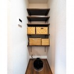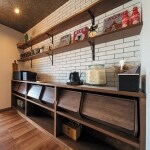 キッチンと隣接したパントリーは、和室の押入れスペースを活かして可動棚を多めに取り付けました。 収納する物の大きさに合わせて、棚板の位置が変えられるので、スペースを有意義に使えます。 かさばりやすいBBQグッズも、日用品や備蓄などのストック品も十分置けます。 パントリーには、お施主様支給の星形ペンダントライトを取り付けました。奥様が絶対に使いたいと気に入られたこの照明を灯すと、天井や壁に陰影が美しく映えます。