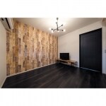 天井と壁はホワイトのクロス、アクセントクロスは古材に釘跡が残るパイン柄でワイルドに。この洋室の床材のみ濃色のチャコールオーク柄を選ばれ、旦那様らしい雰囲気に仕上がりました。