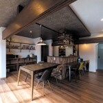 LDKは和室の間仕切り壁を取り払い、床はバリアフリーにした24帖の開放的な空間に間取り変更。 抜けない梁は残して塗装することで、古民家のような佇まいを加えます。 ダイニングキッチンの下がり天井に、ダークカラーのクロスを貼り、吊り下げシェルフを設けて、落ち着いたバーのような雰囲気に仕上げました。 大勢でもゆったり食事ができるよう、ダイニングテーブルと造作したバーカウンターを設けました。 対面キッチンからリビングが見えるので、テレビを見ながら作業できます。 キッチンとお揃いのカップボードを置かない代わりに、以前、床の間があった場所に収納スペース、キッチンに隣接したパントリーを設けて十分な収納をしっかり確保しました。