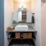 ご夫妻のライフスタイルに合わせて、独立したオープンの洗面室をLDKに隣接させました。 洗面室とLDK間に扉を付けない分、プライバシー性の高い脱衣室は引き戸で開閉できるようにしました。 洗濯機の上に南海プライウッドのランドリーラックを設置して、洗濯用品や洗剤などの定位置を設けました。