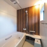 LIXILのシステムバス・アライズは、ブラウン(オンダガタライト)のアクセントパネル、ベージュの床で暖かみを演出。お掃除ラクな床は冬場もひんやりせず、浴槽はお湯が冷めにくい保温構造です。