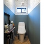 打ち合わせをしていく中で、タンクレストイレではなく、スタンダードモデルのアメージュZAシャワートイレを採用しました。 フルオート便器洗浄搭載で、便座から立ち上がると自動的に洗浄します。 2トーンカラーのトイレ空間は、腰壁クロスはネイビー、上部は遠くから見ると大理石のようですが、目を凝らすと賑やかなイラストが描かれています。ご夫妻にとって想い出のある模様で、おふたりらしい遊び心をもって選ばれました。 クッションフロアはヘリンボーン柄で合わせて、レトロビルを彷彿させるようなコーディネートに。 色々と相談しながら取り付け場所などを決めていき、奥様が気に入って取り寄せられたタオルリングとペーパーホルダー、照明を職人が取り付けました。