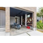 車やバイクが大好きなご主人のご要望に、ガレージ内の収納を多くご提案。おしゃれなバイクが引き立ちます。通常は手前の駐車場に車を停めて、倉庫は趣味の空間です。