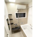 断熱性が高くあたたかいユニットバス、タカラスタンダードのオーダーサイズをご提案。 収納スペースも増え、洗い場も広々。ベージュがあたたかみある浴室に。