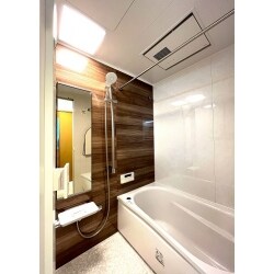 木目調の落ち着いた浴室です。 TOTOリモデルはお掃除ラクラクほっカラリ床です。やわらかで冬場の一歩目もヒヤっとしません。親水層の効果で、汚れ落ちがスムーズ。表面のカラリパターンで翌朝にはカラリと乾き、カビにくいです。 また、ゆるリラ浴槽でリラックスしたお風呂タイムを過ごせます。