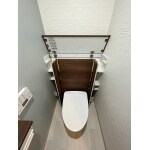 築20年のマンションです。TOTOのレストパルはスッキリとしたデザインでお掃除がスムーズです。便器の後ろのスペースを収納として、有効に活用できます。ブルーグレーのアクセントカラーとミディアムウッドの収納、ペーパーホルダーでナチュラル系レストルームになりました。