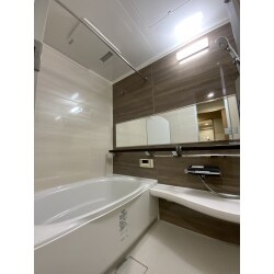 アクセント:ウォールナット、全体はベージュが基調のウッドグレインライトとホワイトのミナモ浴槽で落ち着いた雰囲気に、またワイドミラーとスマートエスコートバーメタルシェルフで安心で便利な浴室になりました。