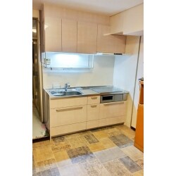 新しいキッチンはクリナップ ステディアを採用いたしました。天板やキャビネット、引出しの底板などにステンレスを使用しており、汚れや臭いが染み込みにくく丈夫に作られています。 現状のキッチンは開き扉の流し台を使われており、収納しづらかったのを引出しのシステムキッチンにすることで収納量が増え、物の出し入れがしやすくなりました。淡いピンクの扉カラーで、フェミニンな大人可愛いキッチン空間に仕上がりました。