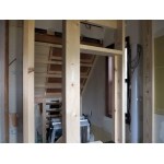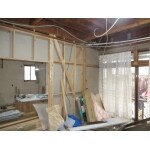 折り戸収納を撤去して冷蔵庫スペースを造りました。その際、構造上必要な柱は残しました。IHコンロの横に油除けの壁を造りました。
