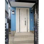 外壁のブルーに合うホワイトの親子ドアーに交換しました。