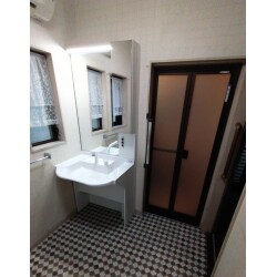 ・車いす対応で、照明・コンセントが付いた洗面化粧台。 ・床なりの解消の為、合板で補強し、その上にクッションフロアを貼る。 以上をご提案させていただきました。
