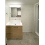 洗面室の入り口を、ドラム式洗濯機が通れる位に大きく拡張。 古い洗面化粧台も交換し、設置場所も変更。すっきりと便利な洗面脱衣所になりました。
