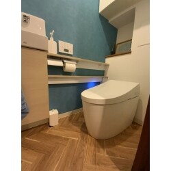 TOTOリモデルに弊社が掲載されており、お問い合わせをいただきました。トイレはTOTOネオレストの手洗い付きをご選択。内装にもこだわりヘリンボーンのクッションフロアと、モスグリーンのアクセントクロスが小さなトイレ空間をおしゃれに彩りました。