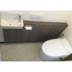 コンパクトなタンクレストイレを採用することにより、トイレ空間を広々と使えるように。別付けであった手洗いも、壁付けにすることで凸凹が無くなり掃除がラクになる様ご提案させていただきました。