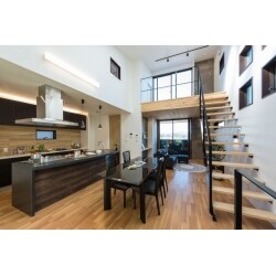 造作に拘った新築住宅。階段の手すりから、キッチンと、色を統一させました。厚いステンレスの天板がより一層豪華に見えます。