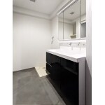 黒い扉がカッコイイ、取っ手レスでスリムな洗面台に。
