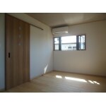 こちらも掃出し窓をやめて、ベッドルームとしました。 アクセント壁の面がベッドの頭側になる為、エアコンを足元側に移動しています。