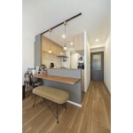 中古マンションを購入し、フルリノベーション。 自慢のキッチンは、お料理に集中しつつもリビングにいるお子さまとコミュニケーションをとれ、 対面型のような一体感もある、すてきな空間に仕上がりました。 お気に入りのキッチンツールに囲まれて、解放感のなかたのしく料理ができそうです。 奥まったところにあり、暗くて狭い印象が気になっていた浴室は、 浴槽の向きを90度回転させ、ひとまわり広いものに入れ替えました。 洗面室の戸を引き戸に変えたことで、スペースが有効活用できるようになり、 ひろびろ洗面台と、大容量の可動棚も設置。 全体が明るく開放的に生まれ変わりました。 リノベーションする前も収納スペースが多い住まいだったのですが、 お子さまの成長とともに、しまうモノはどんどん増えていくもの・・・ 可動棚やハンガーパイプつきのクローゼット、小さな収納をすきまに増やし、より気軽にしまいやすく。 住まい全体がグレイッシュトーンと木目で統一され、やさしい色合いの空間になりました。 親子で過ごす時間がますます楽しくなる・・・そんな素敵な住まいが完成しました。