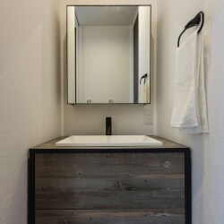 木質感だけでなく、水栓金具からタオル掛けまで統一感を出した洗面化粧台です。