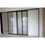 古いビルのため水平垂直を取るのが難しく間仕切も上吊可動間仕切りを提案。施主様がデザインなどお好きな方でしたので デザインにおいては施主様主動で。電気配線などは弊社でご提案しました。