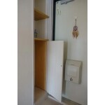 玄関を納戸側に広げて靴の収納スペースを作りました。 収納建具は床から200ミリ浮かして設置しています。 靴が三和土にないとすっきり広くみえます。 不恰好な分電盤は収納内に移しています。