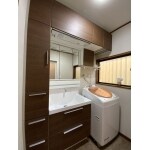 戸建ての水回りをまとめてリフォーム。洗面化粧台はリクシルのエルシィをご選択されました。トールキャビネットやアッパーキャビネットをつけ大容量の収納スペースを確保。スッキリと整った空間が広がります。