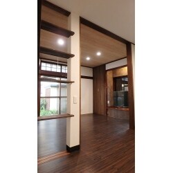 耐震も考慮し柱は残し、下り壁と間仕切り壁の一部を撤去して明るく開放的な空間にすることをご提案させて頂きました。 ・残した柱と壁の間に棚をつけ、植物を置いてインテリアとして。 ・和天井の解体に伴い、今の生活導線を考えてのコンセント再配置、照明器具を再配置。 ・リビングにご希望されていた扉付きの収納を。中にはハンガーパイプと可動棚を取付。 ・天井には取外し可能な室内干し用ハンガーを取付。 もともとの和の雰囲気を残しつつも新しさも取り入れた和モダンな空間造りをご提案させて頂きました。