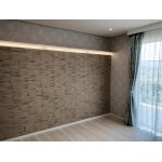 対面の壁面一面にエコカラットを張り、その上部に間接照明を施しました。 間接照明の上にはキャットウォークを設置。 天井にはピクチャーレールを取り付けて、思い出の家族写真を飾れる空間に。 エコカラットは優しい木目のカームウッドを使い、 床材との調和も取れて、全体的に優しい雰囲気の洋室になりました。