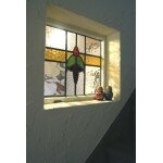 階段や玄関ホールの床はパイン材を使用。階段下の収納など、造作部分をとても気に入っていただけました。 また、壁に埋込まれたステンドグラスは、夜になると階段のフットライトで幻想的な光を映し出します。