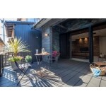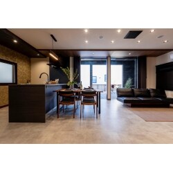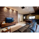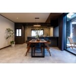 LDKは、ブラックを基調としてスタイリッシュにコーディネートしました。 今回のリフォームでは、老後の介護、車いすでの暮らしを想定したご提案をしております。LDKは、床材に表面強度の高いフロアタイルを採用、空間全体はもちろんウッドデッキまでのアプローチも床の段差をなくしたバリアフリー設計になっています。 天井には、2か所にBluetoothでスマートフォンと連動するスピーカーを設置しました。音楽を楽しみながら寛ぐことができます。