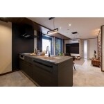 キッチンは、開放的で空間を圧迫しないフルフラット天板のキッチンをご提案。お洒落なLDK空間を引き締めるブラックの扉カラーと耐久性の高いセラミック天板を採用しました。