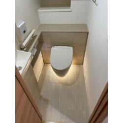 手洗い器を横へ移設し、フロートタイプのトイレを設置。トイレが床から浮いています! お掃除がしやすくなりました。 便器の下から温かみのある間接照明が落ち着いた雰囲気を演出しています。