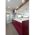 キッチンは、本体上の吊戸棚をなくし開放的で明るい印象に。本体の引き出し収納と背面のカップボードで収納量もたっぷり確保しました。 カップボードの扉はLDK空間になじむホワイトでコーディネート。本体は、キッチンに立つ奥様に落ち着きのあるレッドをお選び頂きました。 キッチンの床にも床暖房を施工しています。