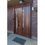 お客様から「外壁を傷めずに工事をしたい」とのご要望がありましたので、玄関ドアは既存枠の上から新しい枠をかぶせる「カバー工法」をご提案。 玄関周りのタイルデザインに合うように、玄関ドアは重厚感のあるデザインを採用。