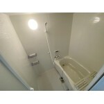 細かい凸凹のパターンのある床で滑りにくいシステムバスルーム。 壁にカウンターがついているのでソープなどを置け、快適に使用できます。 追い焚き機能付きの壁リモコンが設置され、温度調整もらくらく。