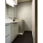 洗面台の横にたっぷり収納出来るキャビネットを置きすっきりとされました。床だけ落ち着いた色に、あとは明るい白で統一され、清潔感のある洗面室になりました。