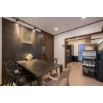 リビングだった和室一間を解体し、ダイニングとつなげて広々と使えるようにしました。床は、ワンちゃんを飼われているため、清掃面を考えてフロアタイルに張り替えました。 ダイニングは、キッチンと同じ素材のダイニングテーブルと壁のアクセントウォールを採用。床や壁の内装は、あたたかみのある色目にして、キッチンやダイニングテーブルが引き立つようにしました。また、アクセントウォールは、デザインだけでなく機能も加えられ、専用の器具で収納棚や机、TVをかけたりすることができます。今回は、写真や絵を飾りたいというご要望でしたので、小物フックを取り付け、写真や絵が映えるようにスポットライトをプラス。雰囲気よく仕上げました。