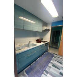 水廻りの入れ替えとご趣味であった手仕事を自宅で開業されるにあたり、和室とリビングを一体化して作業スペースを作りたいとのことでした。 ご要望が明確だったため、順調すぎるほどにあっと言う間に話が進みました。お好みのカラーであったブルーをたくさん使われた壁クロスや床CFは、仕上がってみるととても躍動感あるPOPで楽しい空間になりました。