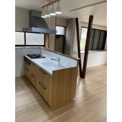 キッチンが対面になることで、おしゃれな雰囲気に様変わり! リビングのお子さんの様子を確認したり、テレビを見たり、窓の風景を眺めたり、と開放的な空間で作業可能になるというメリットもあります! 残した柱は、建具達のカラーに合わせた色に塗り直しております。